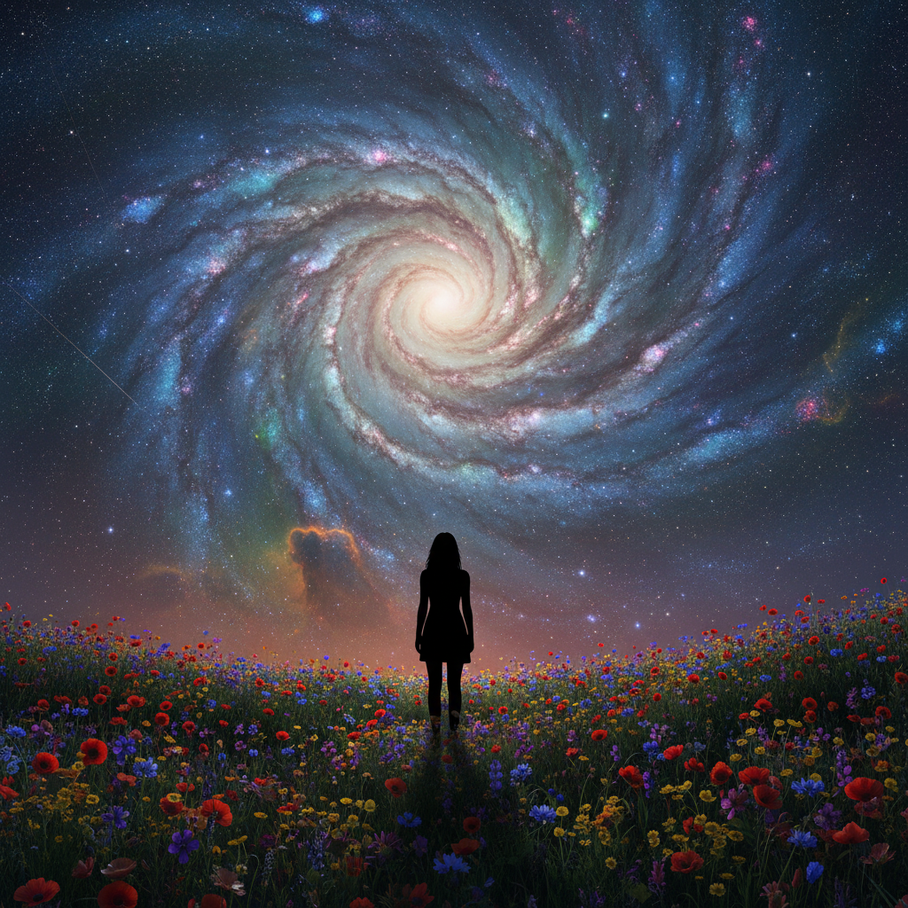 "A huge colorful galaxy spinning and a silhouette of a girl looking up on it standing on a colorful flowery meadow."