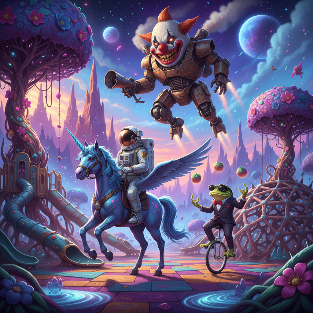 An astronaut riding a unicorn through an alien playground. A giant mecha shaped like a clown is flying in the air above the astronaut. An anthropomorphic frog wearing a suit and sunglasses is riding a unicycle behind the astronaut and the unicorn.