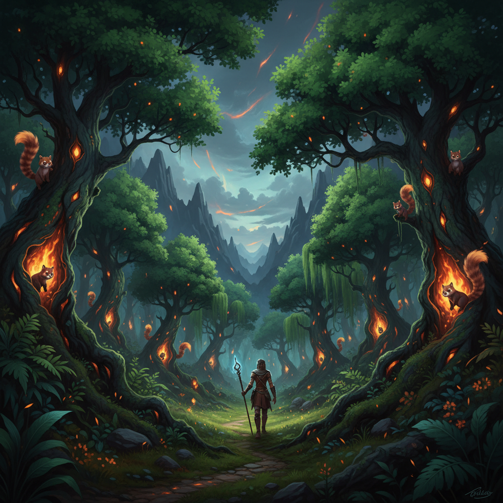 The flourishing trees in Hellish realms glow with a visible inner illusory flame, so as to comply with hell's nature that all things must be aflame. While the many species tree of vary in the presentation of that illusion, they otherwise normal living plants that grant the deep woods a complex flickering lit backdrop to travelers within. These illusory flames providing a whole raft of habits for small furry creatures who must also seem to 'burn', but who merely live within the hollowed trunks basking in the illusory flame's technical compliance with hell's nature. Thus, the deep forests of hell are both leafy life bearing sources of habitat and food for the creatures of hell, but they do put on a good evolved illusory show for the realm's arcane magical rules. The effect should be as a cinematically realistic bucolic twist upon the expectations of how these underworld realms would appear to a planes walker. Remember, green leafy trees with illusory flames peaking from glimpses into their hollowed trunks.