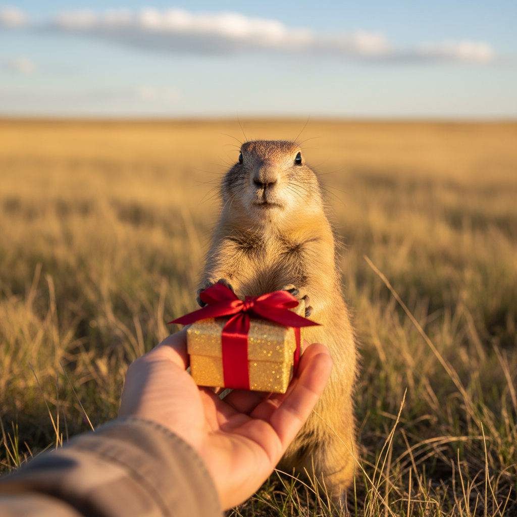 A prairie dog handing me a gift box wrapped with a nice ribbon