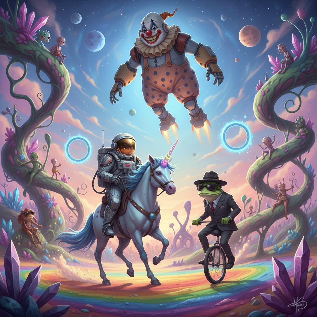 An astronaut riding a unicorn through an alien playground. A giant mecha shaped like a clown is flying in the air above the astronaut. An anthropomorphic frog wearing a suit and sunglasses is riding a unicycle behind the astronaut and the unicorn.