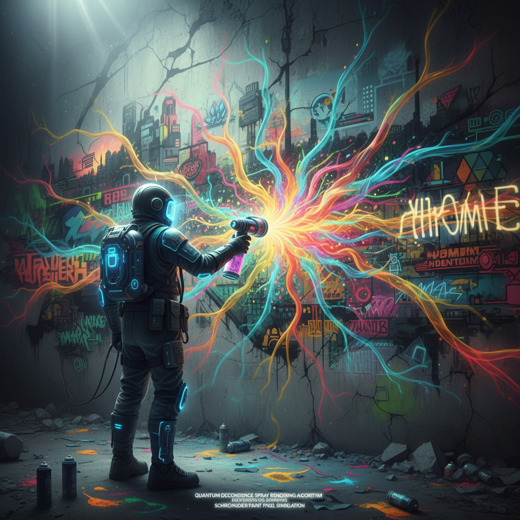 A graffiti artist wielding a quantum spray can, every spray stroke splitting into infinite multiverse versions across the wall, each color layer vibrating between dimensions.((Quantum Decoherence Spray Rendering Algorithm))((Schrödinger Paint Pixel Simulation for infinite layering))((Recursive SubPixel Quantum Glow Interference))((HDR10+ Multi-Dimensional Graffiti Lighting))((StoryDALL-E Adaptive Quantum Multiverse Tagging))((Deep Super-Resolution Quantum Particle Collisions))((GAN-Post Quantum Uncertainty Edge Preservation))