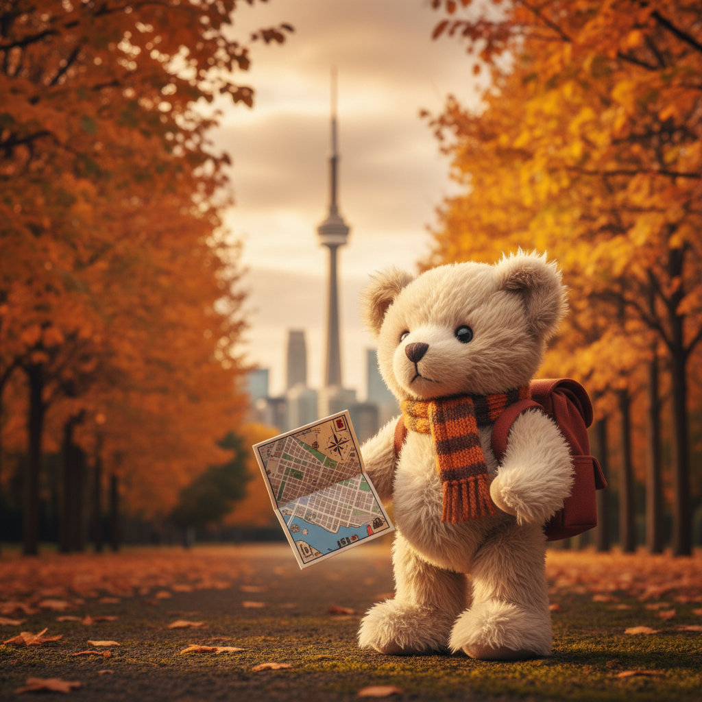 Cute fluffy teddy bear, standing in front of Toronto skyline with CN Tower in the background, holding a city map, surrounded by orange and red autumn trees, cozy fall outfit with scarf and little backpack, soft and dreamy style, high detail.