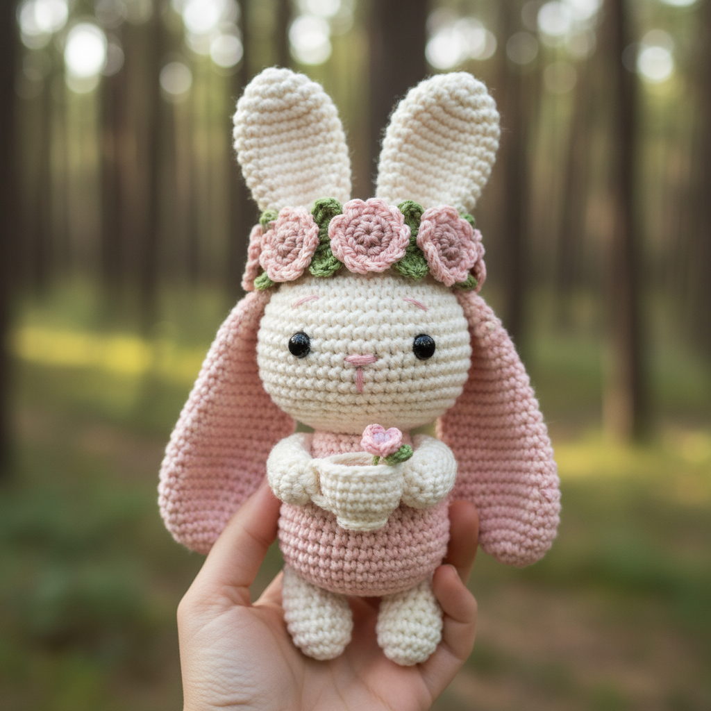 A close-up of a crocheted bunny toy in pastel pink and ivory white, held in a hand mid air toward forest, adorned with a pastel pink sunflower crown and holding a small crocheted teacup with a flower sprig, against a blurred natural green background. Amigurumi style, high detail.