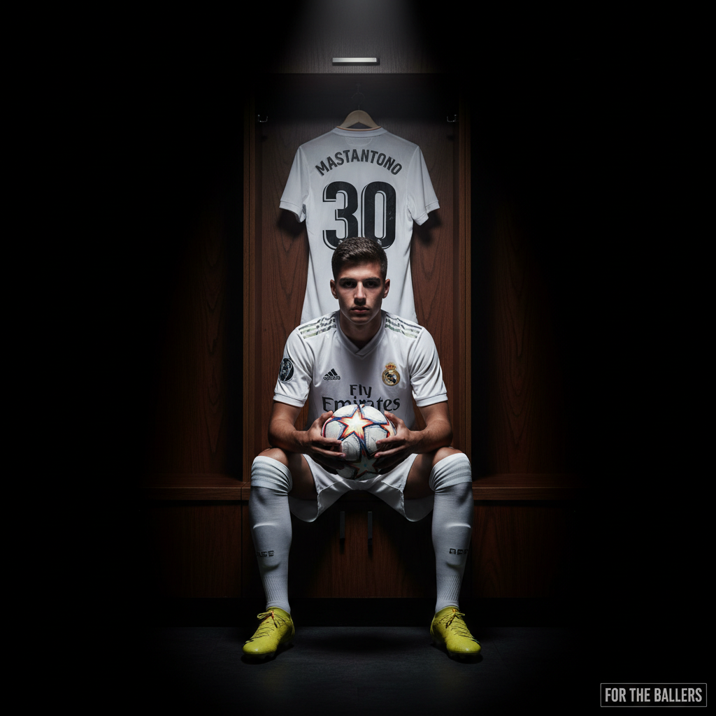 A hyper-realistic studio-style photograph of a football player exactly looking like the one uploaded in this picture sitting confidently in a locker room. He is wearing a Real Madrid home jersey (white with Fly emirates better Sponsor and Adidas logo), paired with white shorts, white knee-high football socks, and yellow football boots. The player sits on the locker bench, holding a UEFA Champions League ball firmly with both hands between his knees, looking directly at the camera with a serious and composed expression. Behind him, inside the wooden locker, a second Real madrid jersey with the name "Mastantuono" and the number 30 is hanging, clearly visible and perfectly centered in the frame, illuminated by focused overhead lighting that highlights the jersey text and number. 36 looking directly at the camera with a serious and composed expression. Photography & Camera Specifications: Lighting: Single soft spotlight with dramatic contrast, creating a cinematic locker-room atmosphere with dark vignette edges. Camera Angle: Eye-level, straight-on centered composition. Lens: 50mm prime lens for a balanced portrait perspective. FOR THE BALLERS Aperture: f/2.8 for sharp subject focus and slight background separation. Shutter Speed: 1/160 sec to freeze subject details. ISO: 200 for clean, noise-free image. Color Tone: Deep blacks and rich reds with subtle highlights to emphasize the Real Madrid identity. Mood: Strong, professional, and inspirational sports portrait Ultra-detailed realism, cinematic depth, professional fashion editorial quality.