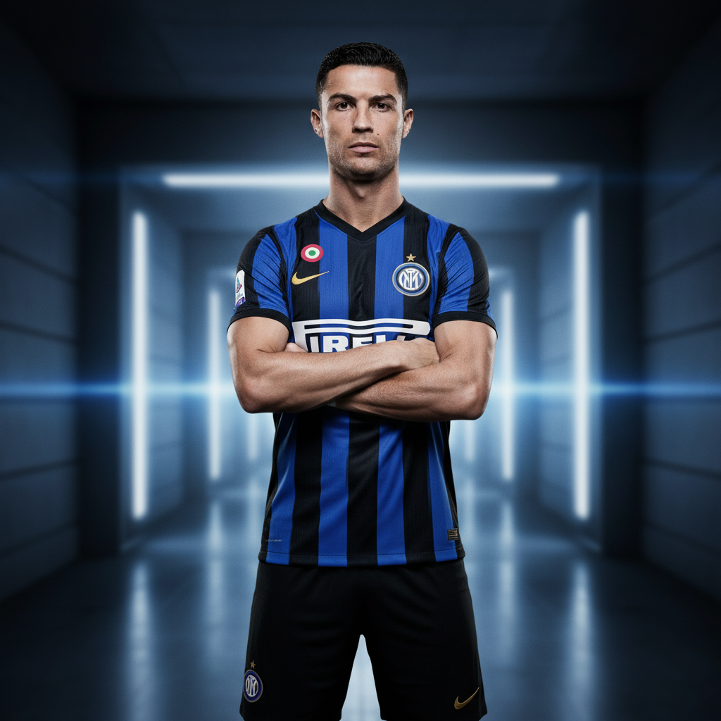 Generame una foto de cristiano rolando como una foto de presentacion con una equipacion de este estilo inter de milan pero sin escudo