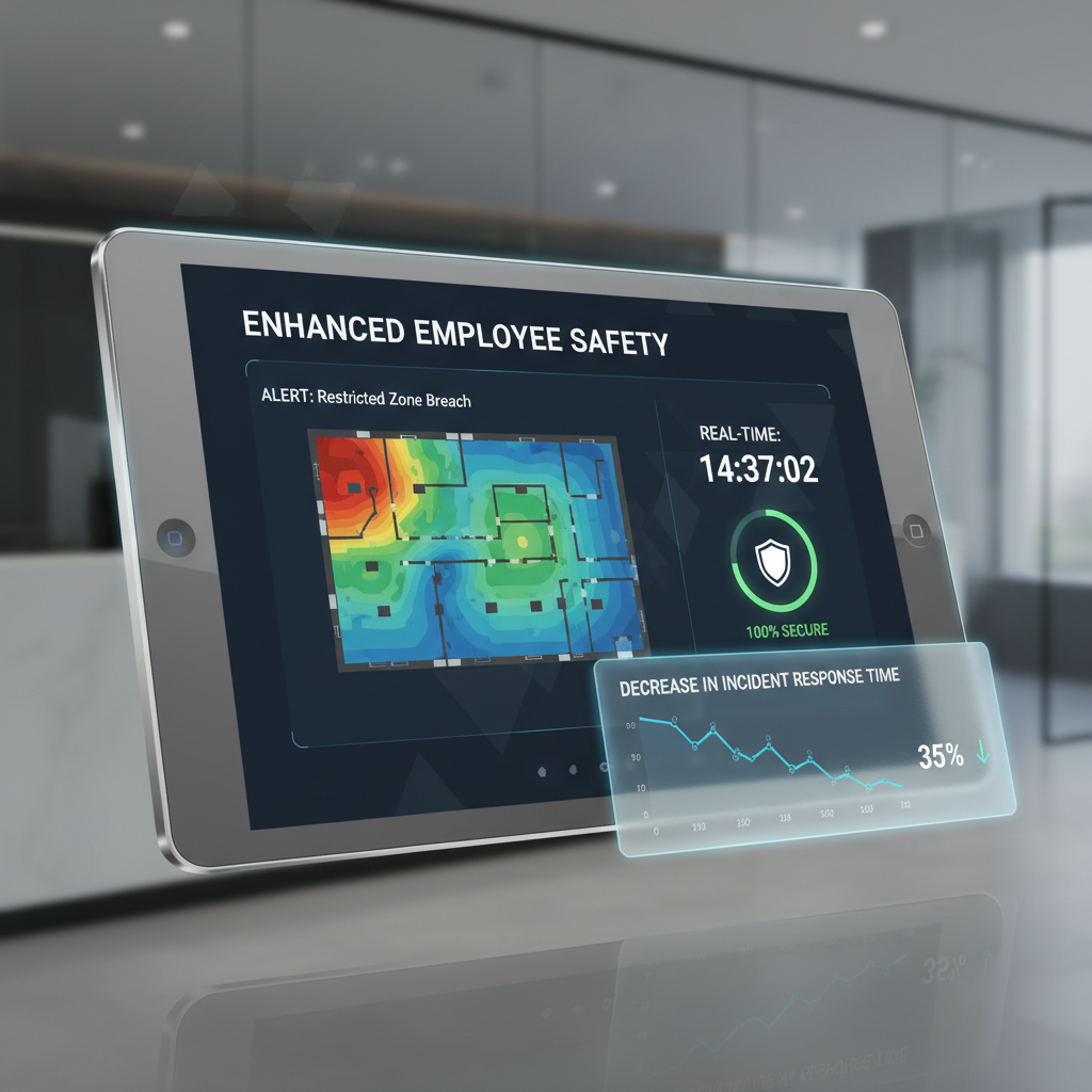 Same style as requested previously: Visually create this image:  Enhanced Employee Safety Concept: Real-time Monitoring & Alert Dashboard Description: A layered graphic featuring a stylized tablet or large smartphone screen as the primary element. Background Layer: A subtle, blurred image of an office lobby or secure entrance (showing the "work environment"). Main Graphic: The screen displays a clean, modern security dashboard. Show a green-to-red heat map of a floor plan with one area highlighted in red (representing a threat alert). Include a small, prominent, digital clock/timer showing "Real-time" and a simple icon of a shield or lock surrounded by a circular progress bar at 100% (representing secure environment). Floating Element: A smaller, partially transparent card floats over the tablet, showing a bar graph or line graph demonstrating a "Decrease in Incident Response Time." Why it works: It clearly communicates "monitoring," "alerts," and "security solutions" while maintaining the data-focused, clean aesthetic of the template.